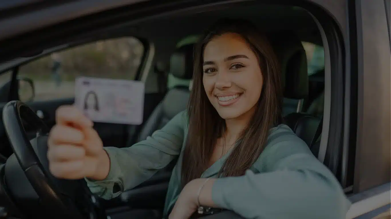 Glimlachende vrouw toont rijbewijs in auto na geslaagd rijexamen bij rijschool